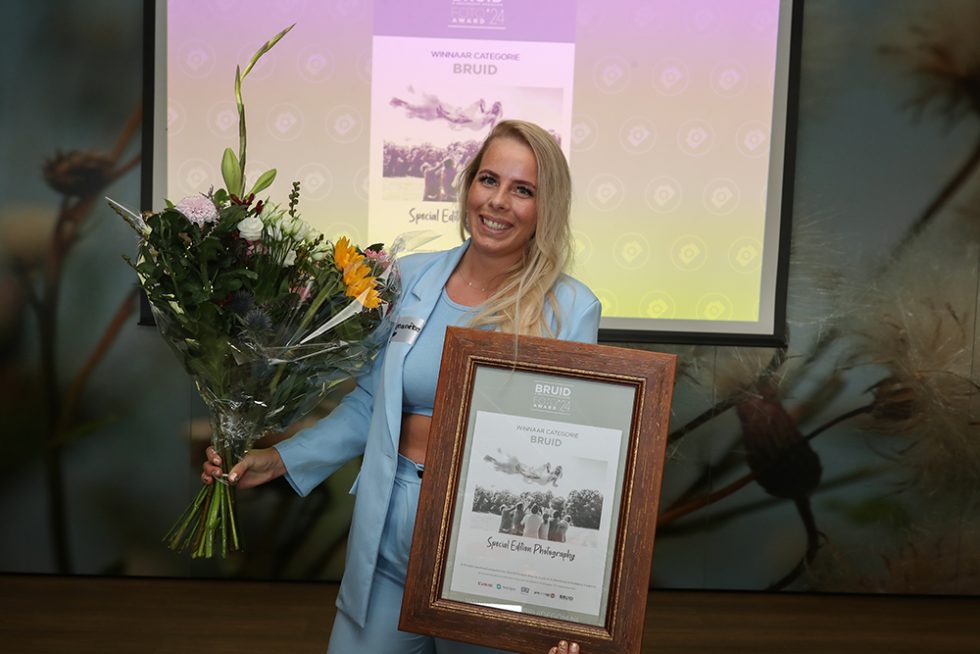 Daar komt de bruid! In deze categorie ging de award voor beste foto naar Special Edition Photography! Zij wist haar bruid op een speelse en leuke manier vast te leggen. Marieke: “Supertof, ik ben helemaal blij! Ik ga thuis een mooi plekje voor de award uitzoeken.”