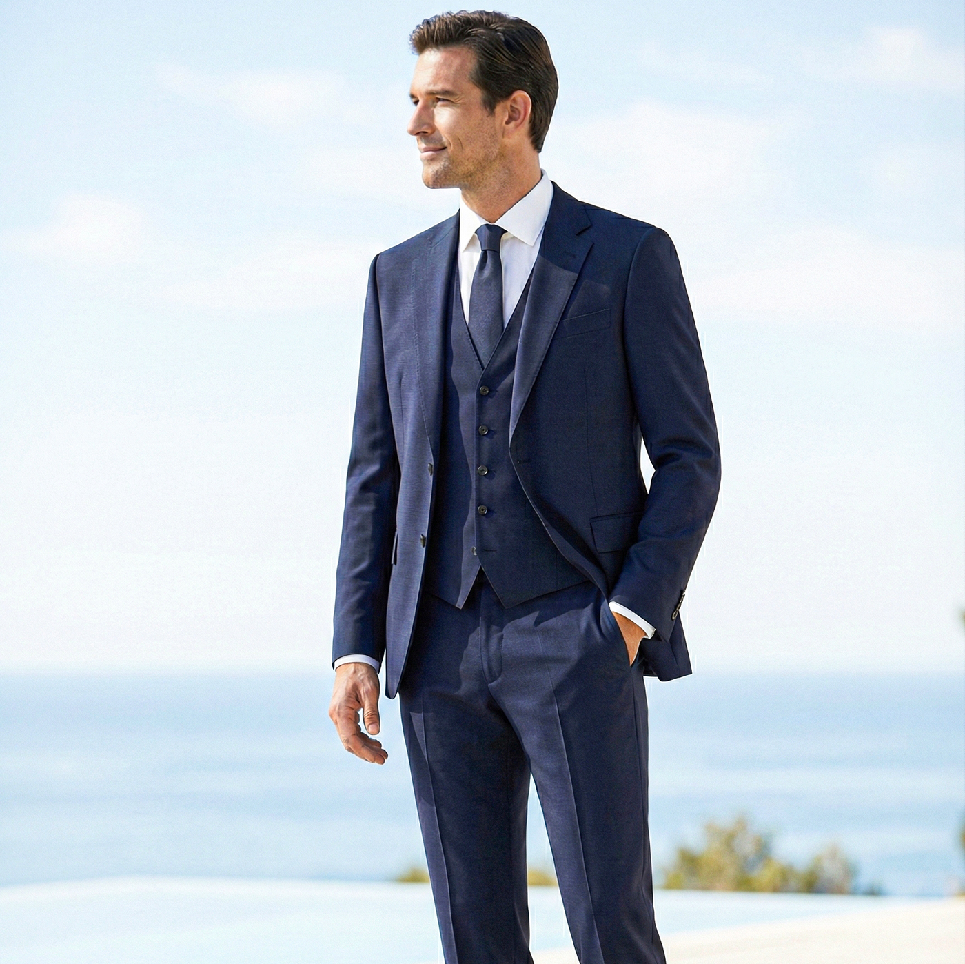 Binnen de huidige trouwmodetrends zien we ruimere, ontspannen stijlen en natuurlijke kleuren zoals steen, bruin en groen. Klassieke blauwtinten blijven populair, terwijl moderne pasvormen comfort combineren met een elegante, licht getailleerde snit. Hoogwaardige stoffen zorgen voor extra diepte en een luxe uitstraling.
