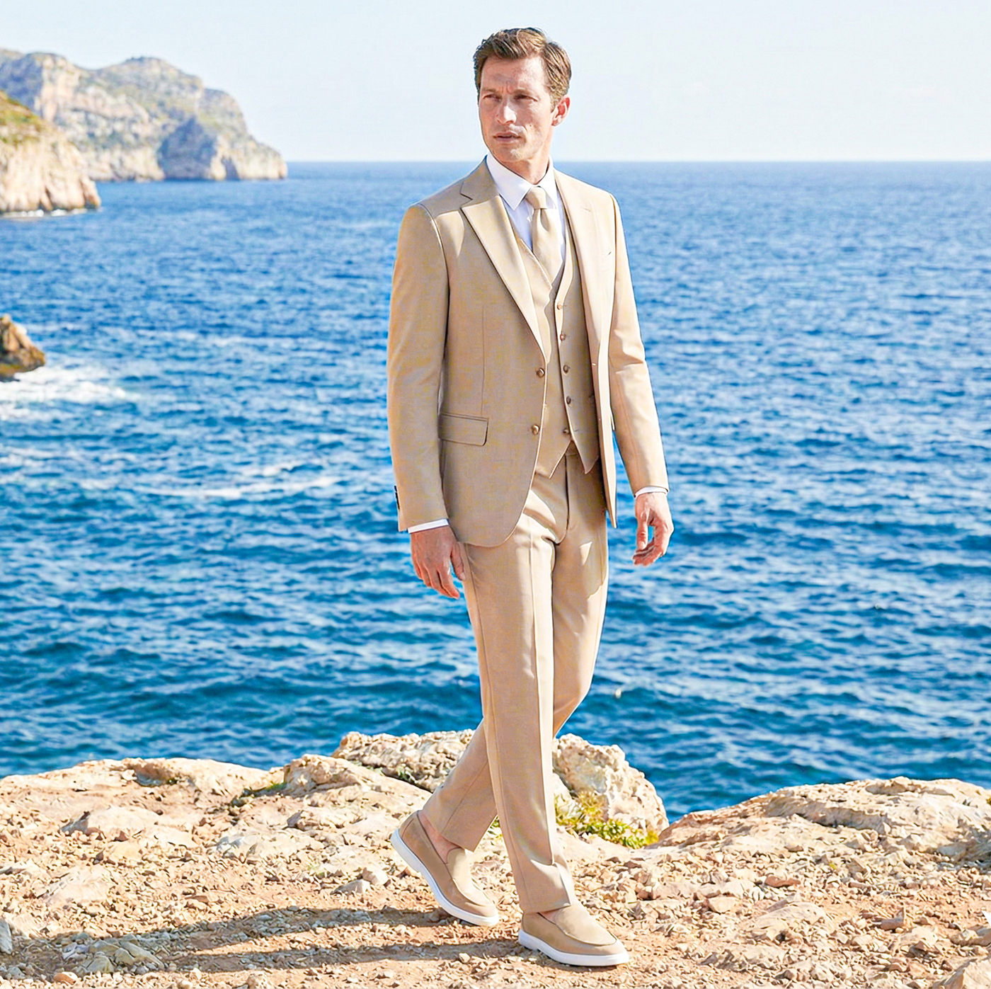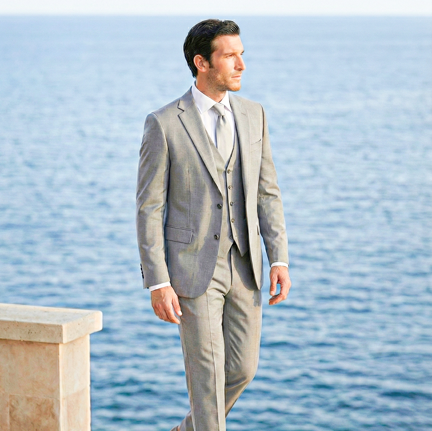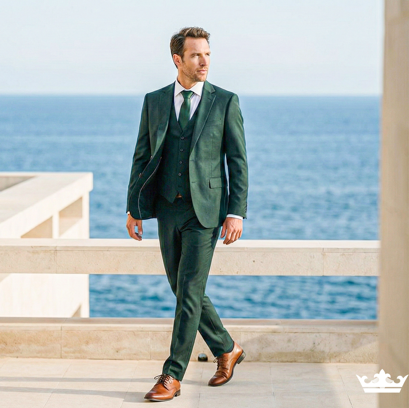 Binnen de huidige trouwmodetrends zien we ruimere, ontspannen stijlen en natuurlijke kleuren zoals steen, bruin en groen. Klassieke blauwtinten blijven populair, terwijl moderne pasvormen comfort combineren met een elegante, licht getailleerde snit. Hoogwaardige stoffen zorgen voor extra diepte en een luxe uitstraling.