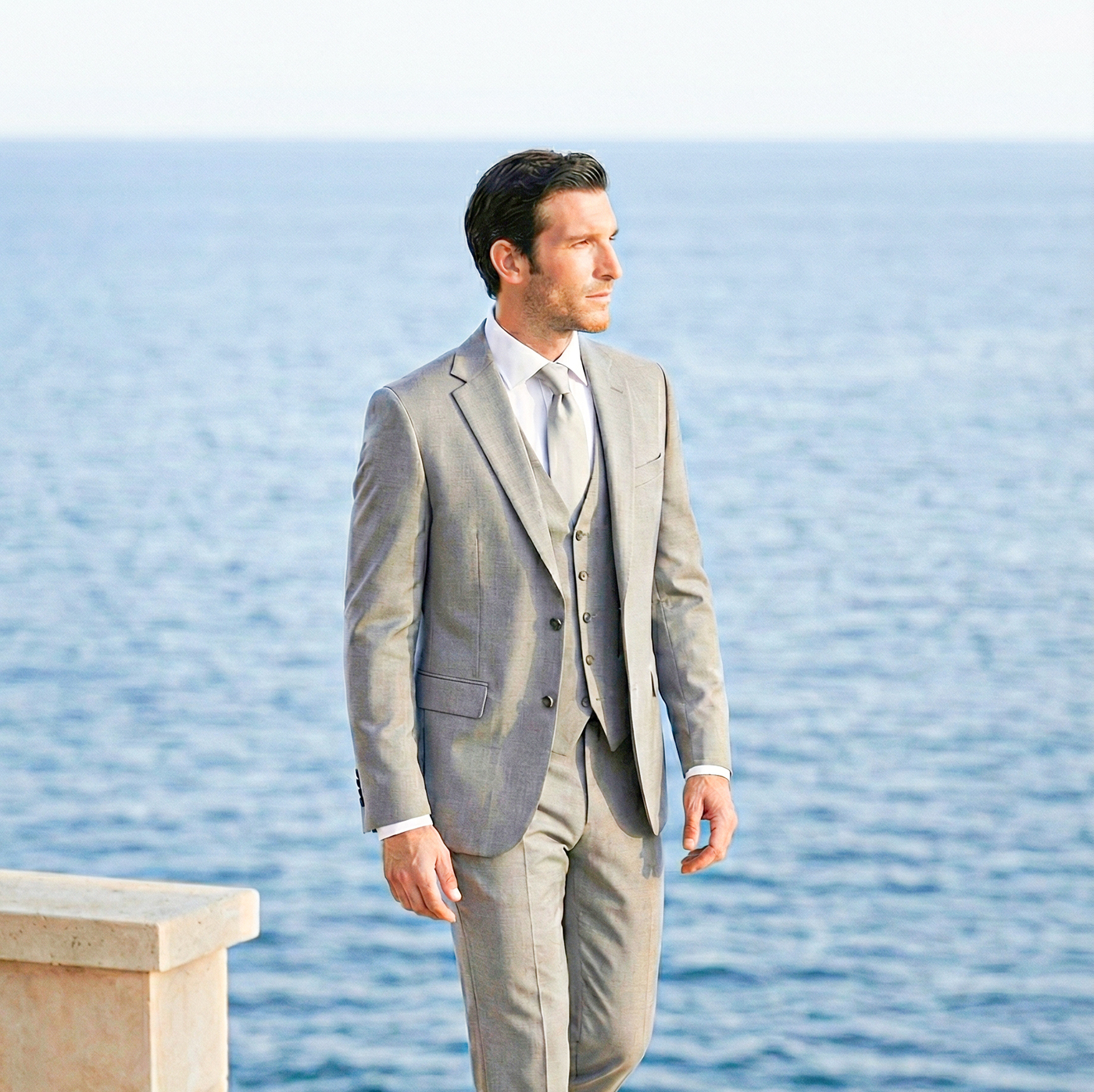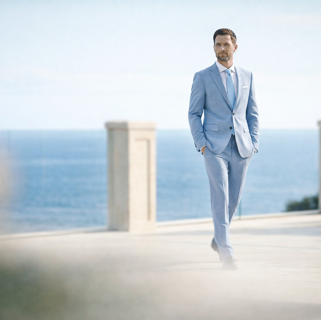 Binnen de huidige trouwmodetrends zien we ruimere, ontspannen stijlen en natuurlijke kleuren zoals steen, bruin en groen. Klassieke blauwtinten blijven populair, terwijl moderne pasvormen comfort combineren met een elegante, licht getailleerde snit. Hoogwaardige stoffen zorgen voor extra diepte en een luxe uitstraling.