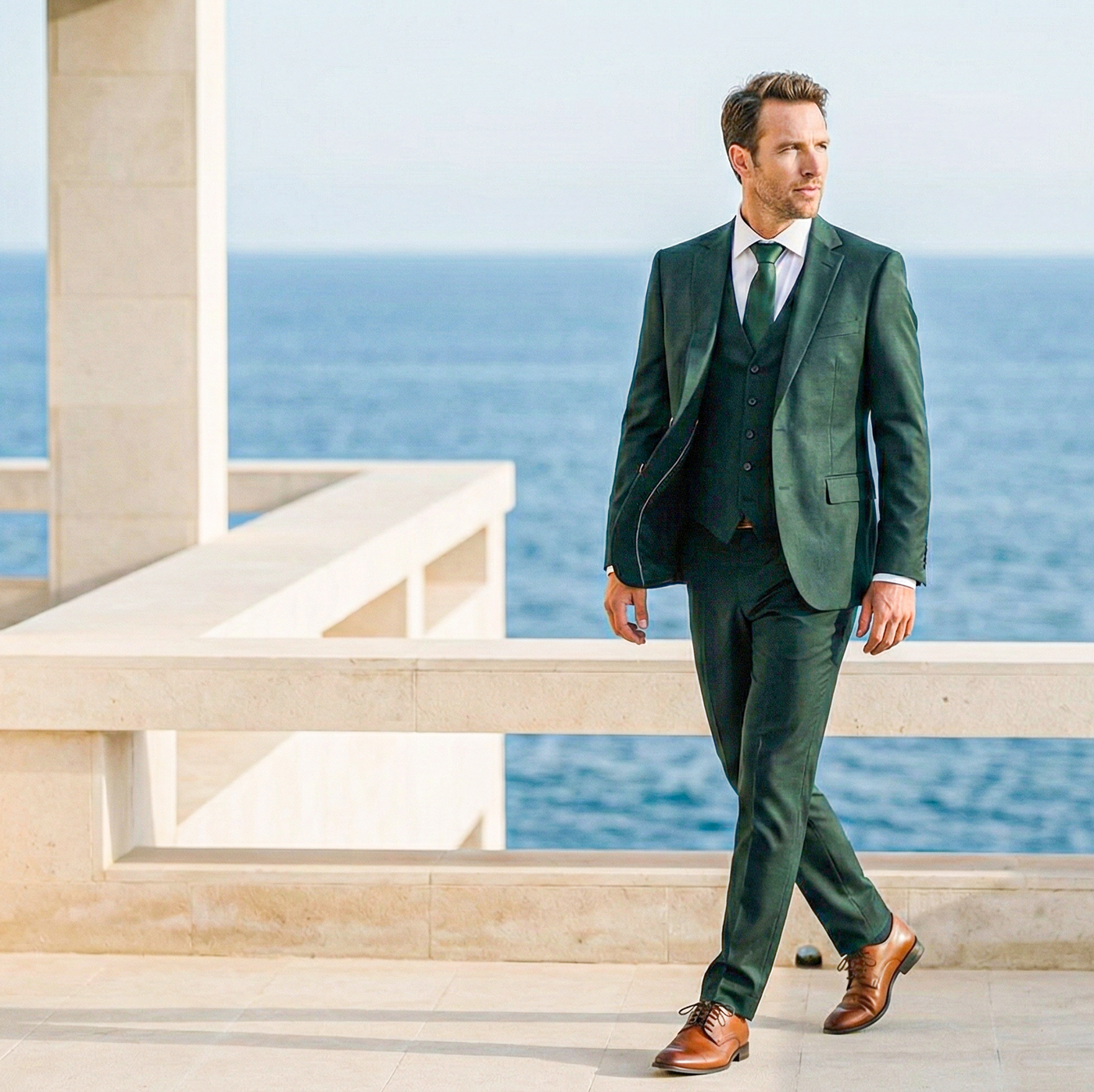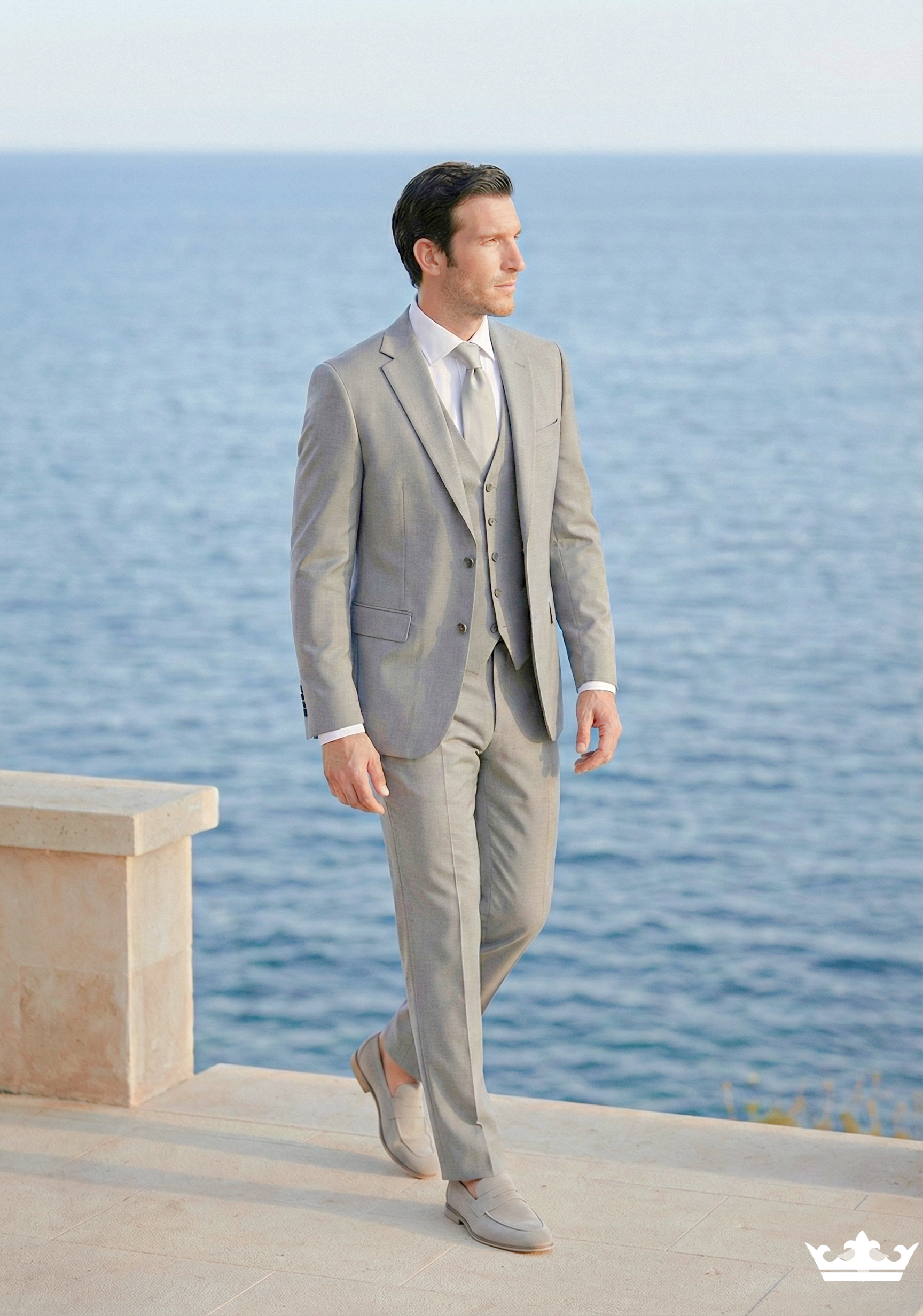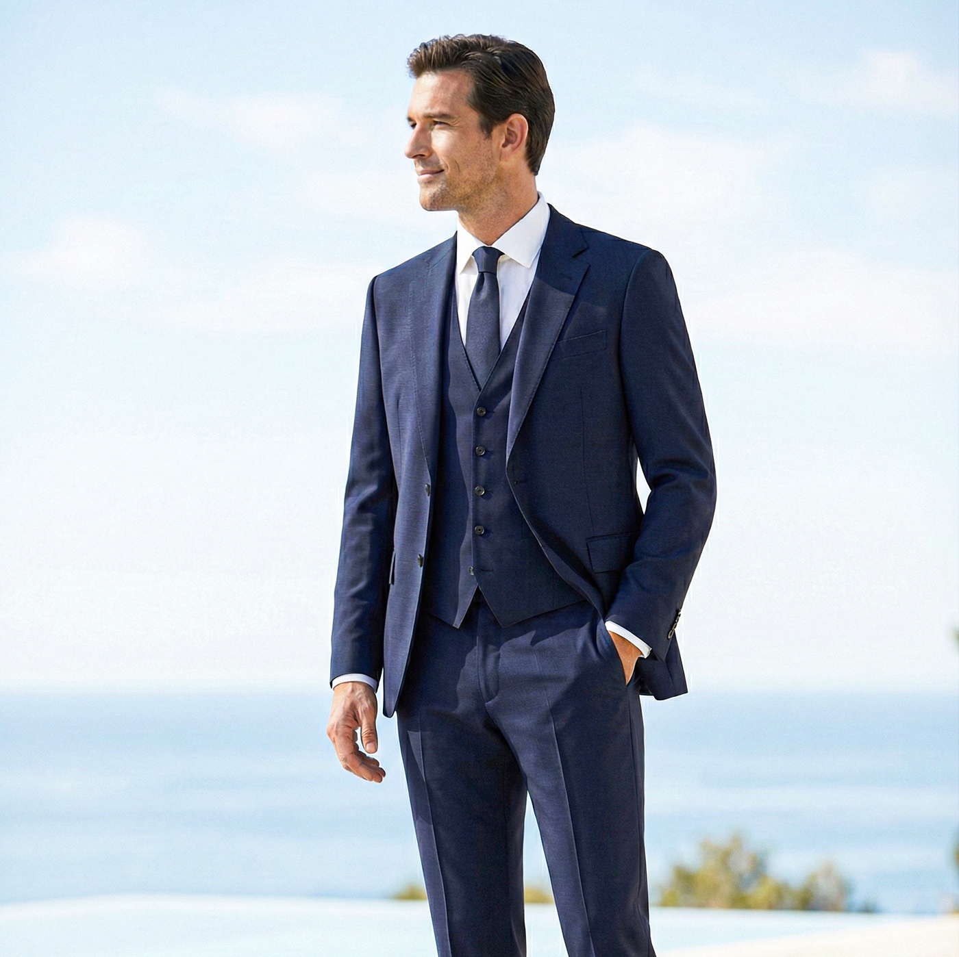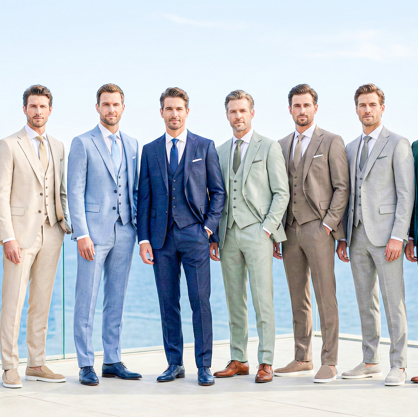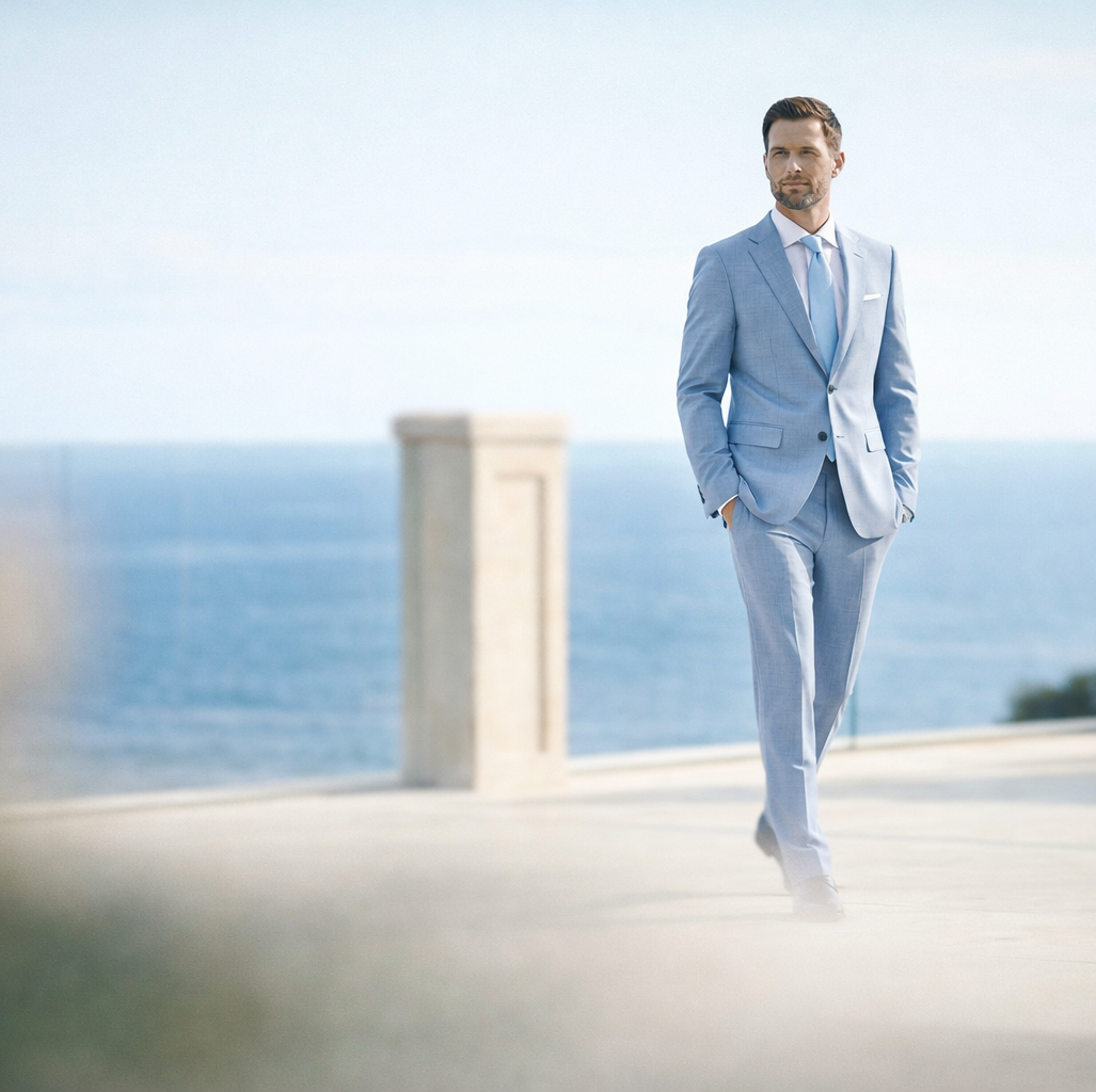 Binnen de huidige trouwmodetrends zien we ruimere, ontspannen stijlen en natuurlijke kleuren zoals steen, bruin en groen. Klassieke blauwtinten blijven populair, terwijl moderne pasvormen comfort combineren met een een elegante, licht getailleerde snit. Hoogwaardige stoffen zorgen voor extra diepte en een luxe uitstraling.