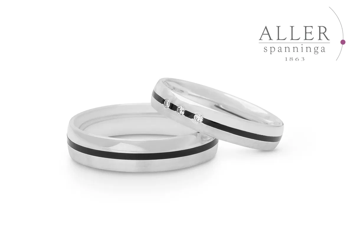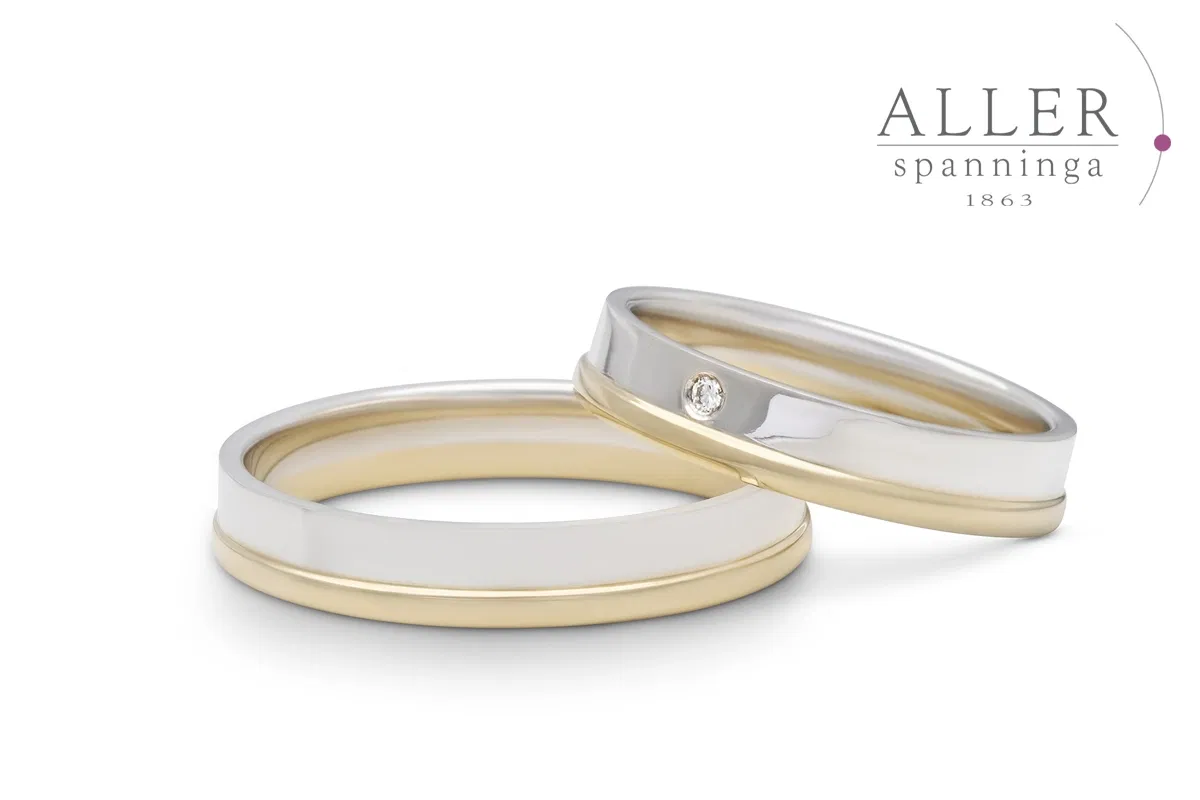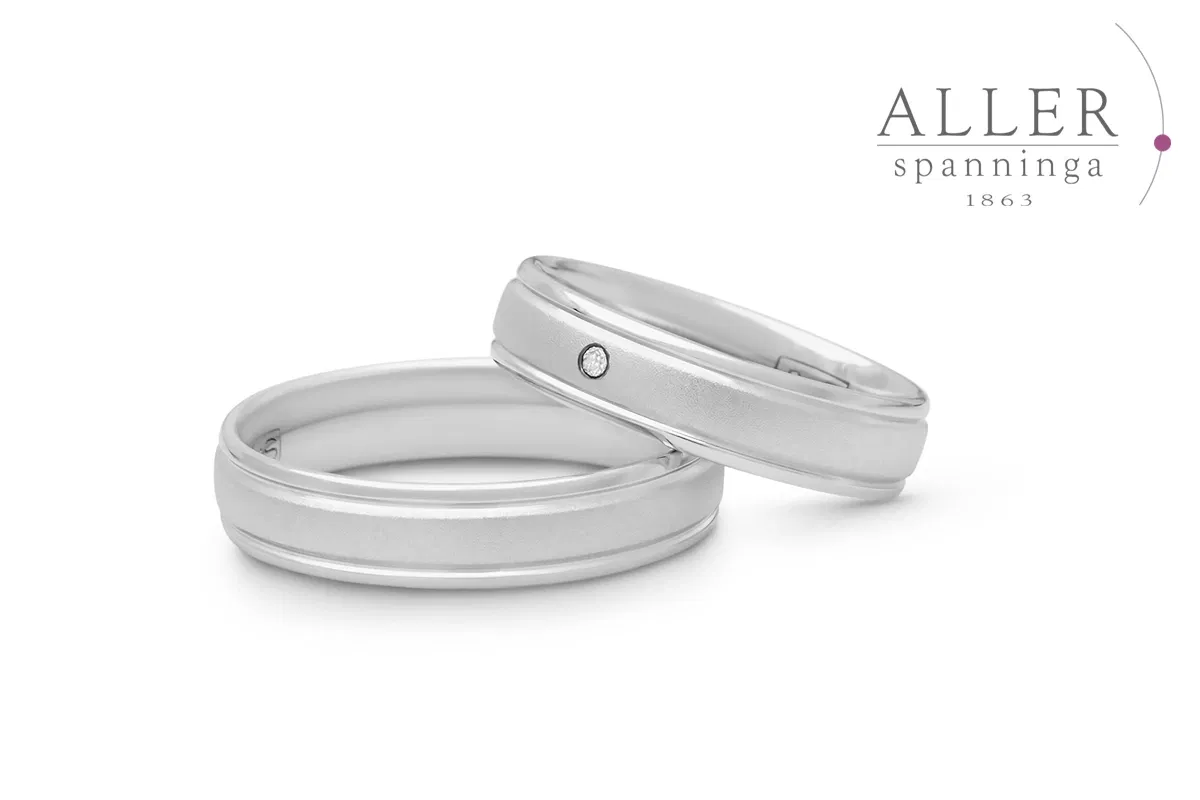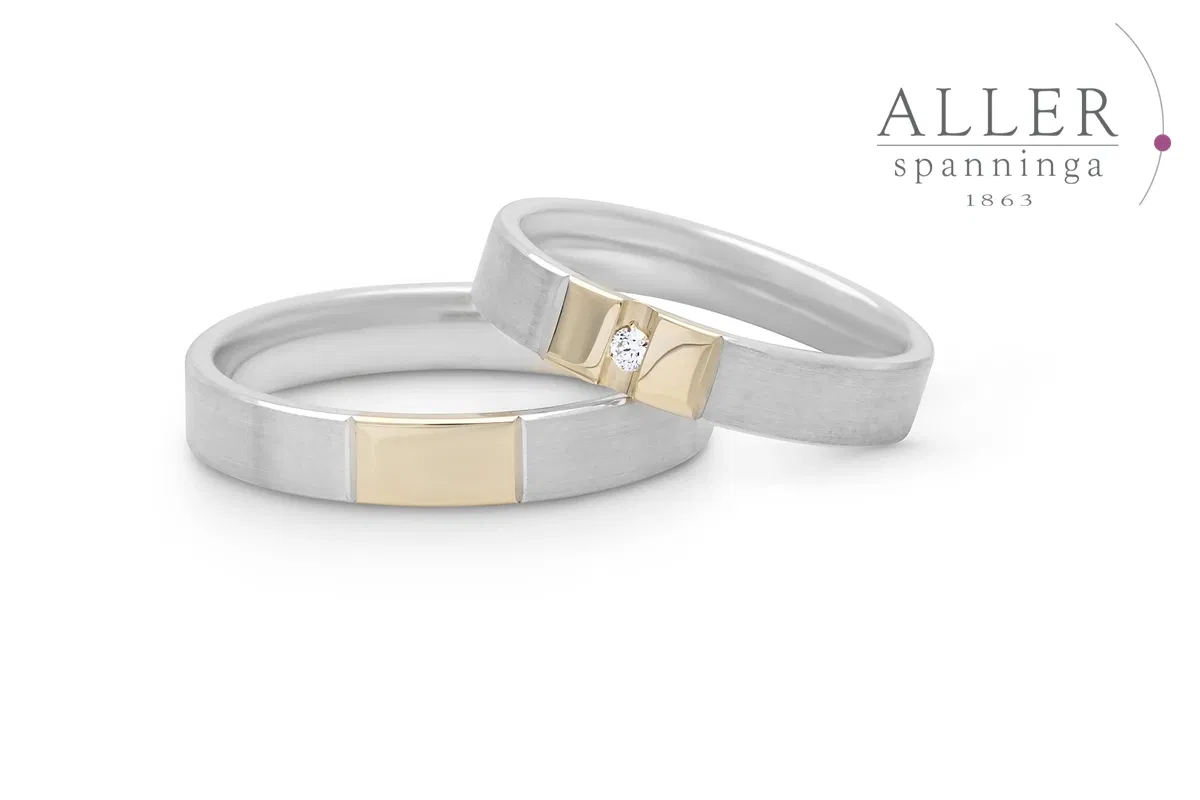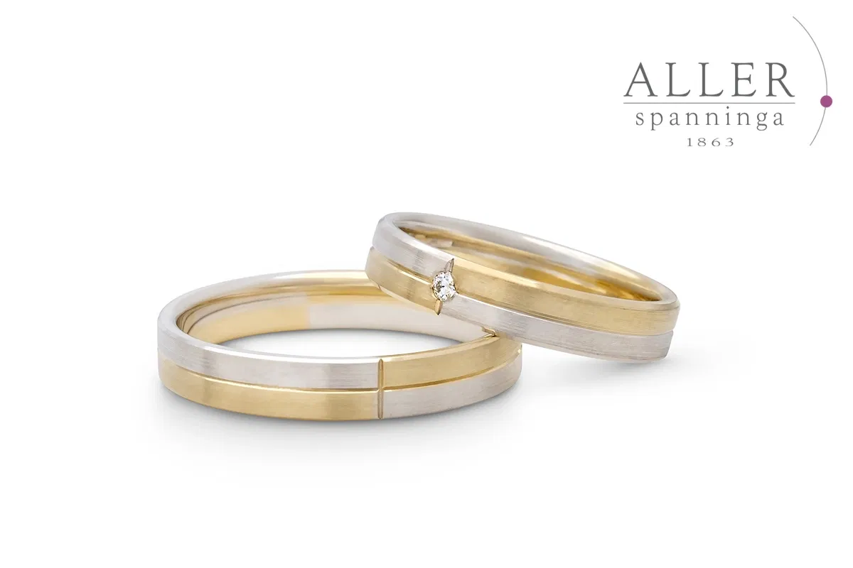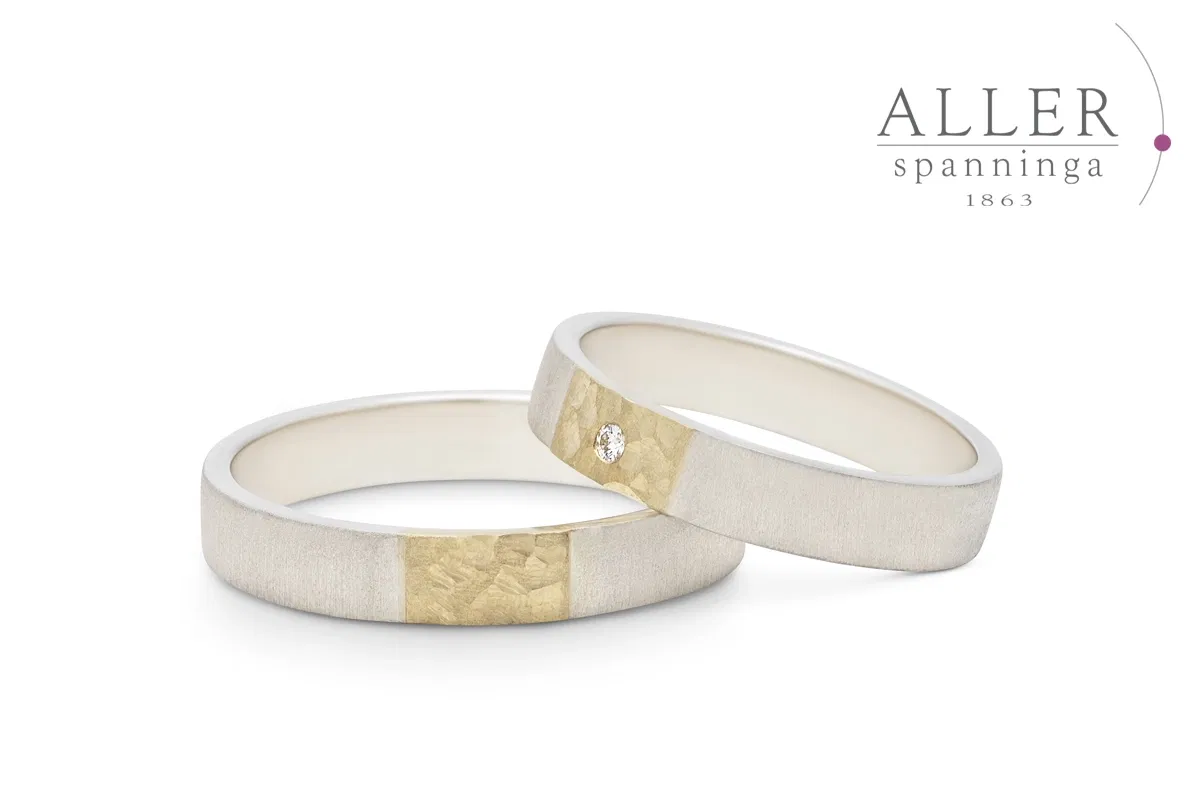 De standaardcollectie van Aller Spanninga bevat zowel klassieke gladde ringen als moderne gestileerde ringen. Gemaakt van รฉรฉn kleur goud of van drie kleuren goud, met of zonder diamant. Maar de collectie bevat ook ringen gemaakt van zilver en palladium. Nieuw is argentium; een moderne zilverlegering waarbij een deel van het koper is vervangen door germanium. Het resultaat is een edelmetaal dat minder snel oxideert, een wittere glans heeft รฉn sterk is: ideaal voor trouwringen รฉn met een gunstiger prijsstelling!