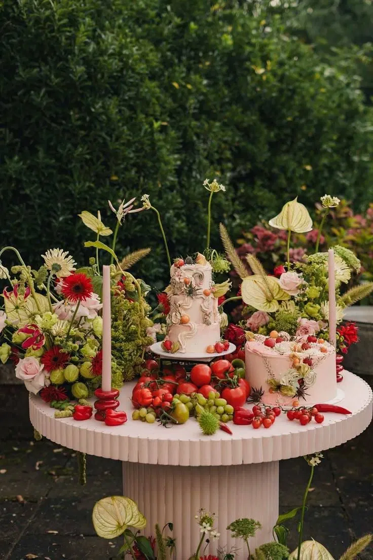 De bruidstaart staat in 2026 niet meer in z’n eentje op een saaie tafel. Het draait om de complete presentatie. De ’taart-tafel’ wordt een kunstwerk op zich, aangekleed met golvend linnen, flikkerende kaarsen, losse bloemen en fruit. De taart is het middelpunt, maar de styling eromheen maakt het plaatje compleet.