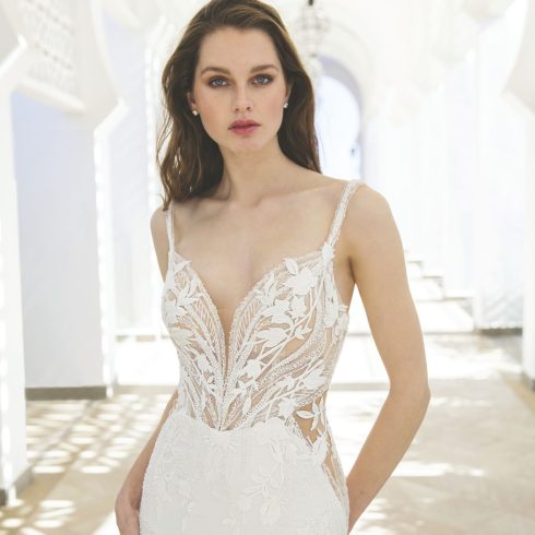 Model Taliana (foto linksboven) heeft een glamoureus zeemeerminnen-silhouet en kenmerkt zich door prachtig kant geborduurd met 3D-bloemen, met parels bezette kanten motieven en verfijnde bladornamenten, die eveneens met volumineuze bloemen en parels zijn versierd.