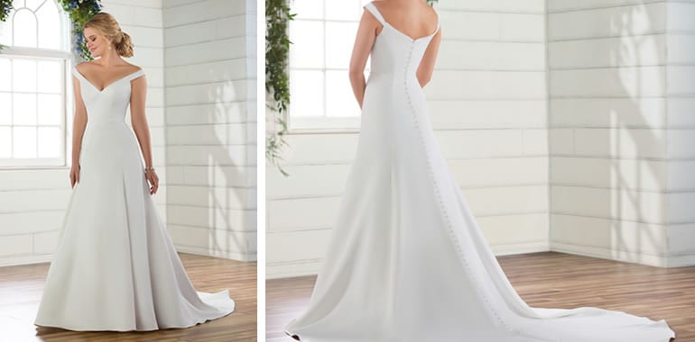Ingetogen, eenvoudige elegantie – dat was precies het idee en de inspiratie voor deze trouwjurk van Essense Of Australia. De mouwloze A-lijn met zijn elegante stijl is perfect voor je grote dag! De satijnen jurk heeft ook een schoudervrije V-hals en een zichtbare dubbele naad. De afneembare stoffen riem benadrukt de taille, lichte plooien, geeft de rok vorm en structuur en zorgt voor een charmante bruidslook.