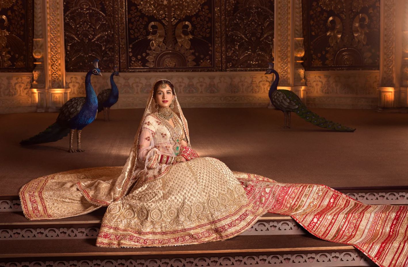 Voor dit traditionele moment droeg Radhika een unieke couture look van Abu Jani en Sandeep Khosla in rood en wit, ter ere van de Gujarati traditie van panetar. Haar ghagra was versierd met bloemen, edelstenen en pailletten. Tot slot droeg ze een sluier van 180 centimeter met een delicaat jaali-patroon en ajourwerk. “Mijn sluier was een waar Zardozi wonder,” zegt Radhika, verwijzend naar de culturele term voor goudborduurwerk.