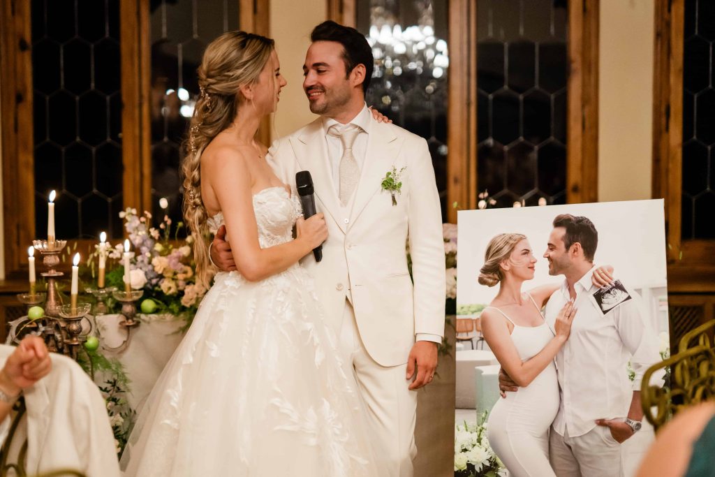 Als verrassing hadden Lynn en Alex voor iedere gast een persoonlijke kaart geschreven. Ook de dierbaren die overleden waren, kregen een kaartje. Deze werden dan bij de achtergebleven partner gelegd. โToen iedereen hun kaartje gelezen had, begonnen we onze speech om iedereen te bedanken. Alex sprak mijn familie in het Nederlands aan en ik die van hem in het Catalaans. Vervolgens deden we een bijzondere mededeling; namelijk dat ik destijds al 17 weken zwanger was!โ