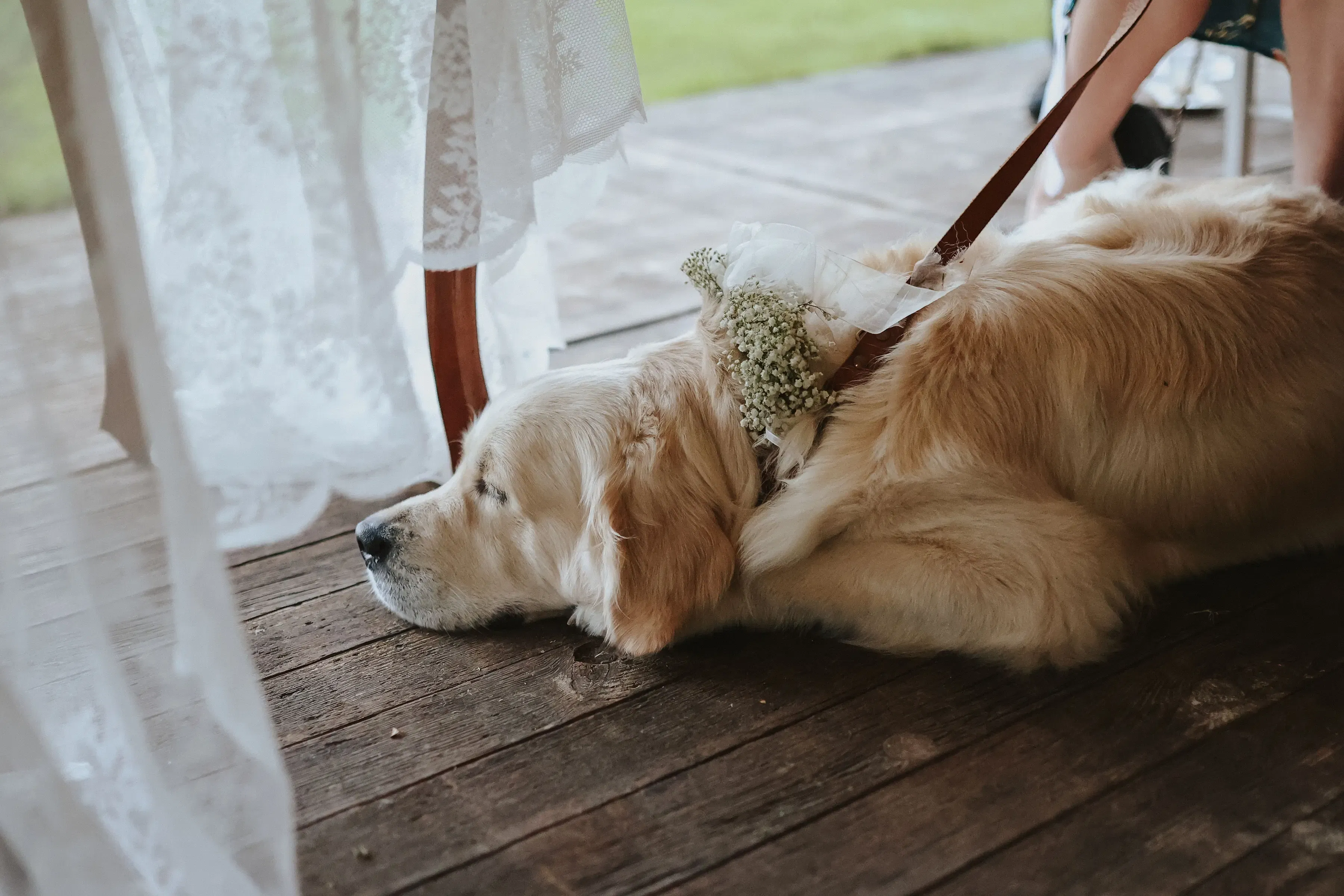 Donnie was ook van de partij tijdens de ceremonie. Hij had de bijzondere taak om de trouwringen te brengen. โWe durfden hem niet los te laten tijdens de ceremonie, omdat hij vaak erg enthousiast is. Een vriendin had zijn lijn vast en toen hij de ringen mocht brengen kon hij gelukkig dichtbij genoeg komen.โ Hij had duidelijk door dat het zijn time to shine was, want hij kwispelde zich rot en plofte direct neer voor belly rubs. Martijn: โHij lag op de ringen, maar gelukkig konden we zijn halsband draaien om erbij te komen.โ