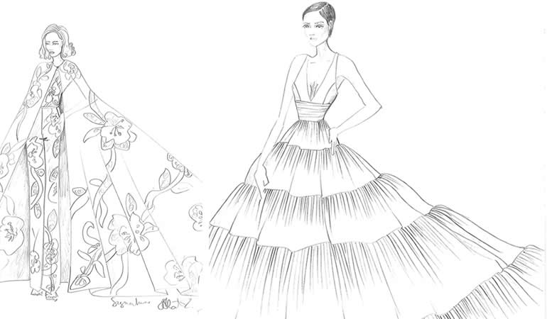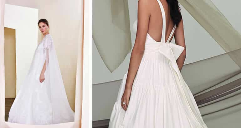โEen andere favoriete jurk is Kalina (links). De patchwork-cape is bezaaid met geborduurde romantische bloemen en symboliseert ware liefde. De jurk is in combinatie met het eenvoudige silhouet van de fitโn flare-mantel alles wat je je maar kunt wensen voor de allermooiste dag.โ โIn de Justin Alexander Signature-collectie staan deze twee ontwerpen hoog op mijn favorietenlijst. Het Roma-model (rechts) uit de nieuwe 2020-collectie vind ik geweldig. Deze moderne tafzijde baljurk is een coole herinterpretatie van de clean chiclook. Voor dit bijzondere model combineerde ik een geplooide buikband met een meerlagige rok.โ