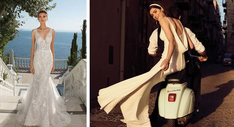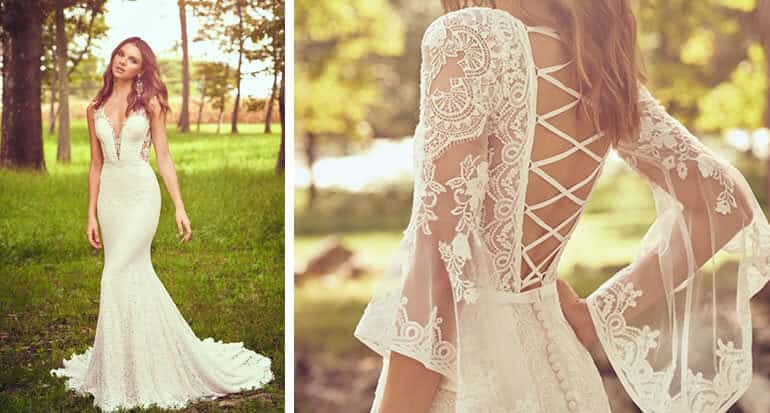 โDeze jurk van Venetiaans kant (linker jurk) met een kleine sleep belichaamt pure romantiek. Ik ben een grote fan van een diep illusiedecolletรฉ met cut outs aan de zijkant.โ โDeze klassieke A-lijn jurk (rechts) is een boho-droom die uitkomt. De ballonmouwen en de moderne, geregen rug zorgen voor een magisch totaalplaatje.โ