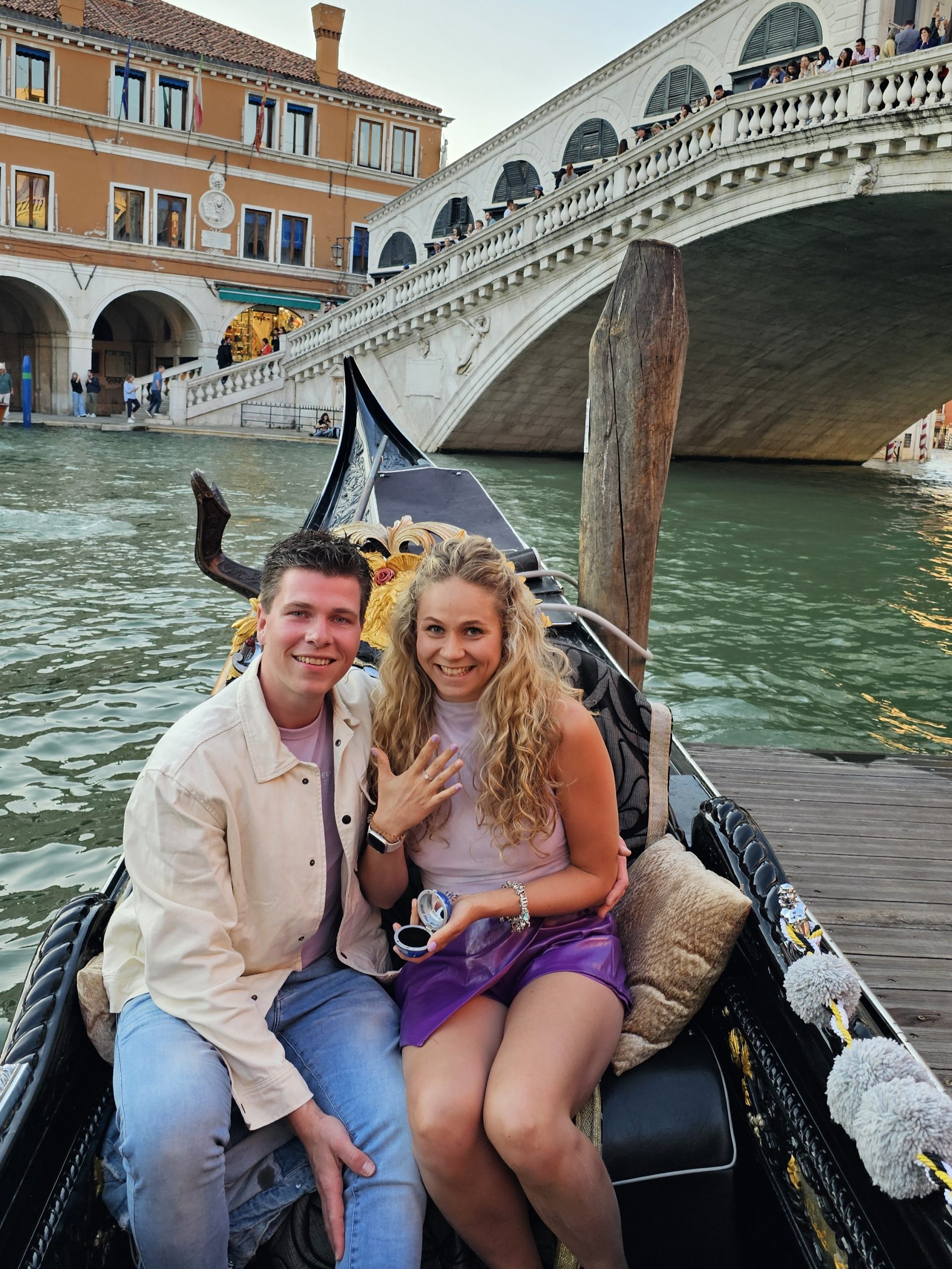 “Aan het begin van de vaart vroeg hij aan de gondelier, of hij zijn telefoon vast wilde houden om wat foto’s te maken. Ik heb de hele vaart lang niet door gehad dat hij mij ten huwelijk ging vragen, de gondelvaart was gewoon relaxed en gezellig. Aan het einde van de vaart, terug bij de Rialtobrug, wilde de gondelier een foto van ons maken. Hij vond dit de mooiste plek van de vaartroute namelijk. Natuurlijk stemden wij daarmee in en we liepen naar het puntje van de gondel. Hier ging Lars opeens op één knie. Ik had dit totaal niet zien aankomen, aangezien hij totaal niet zenuwachtig overkwam. Natuurlijk zei ik volmondig ja! Hij wist ook al stiekem van tevoren dat ik ja ging zeggen. Dat was ook de reden dat hij in de loop naar het aanzoek toe niet zenuwachtig is geweest. Ik heb het er namelijk vaak met hem over gehad dat ik zou willen trouwen.”