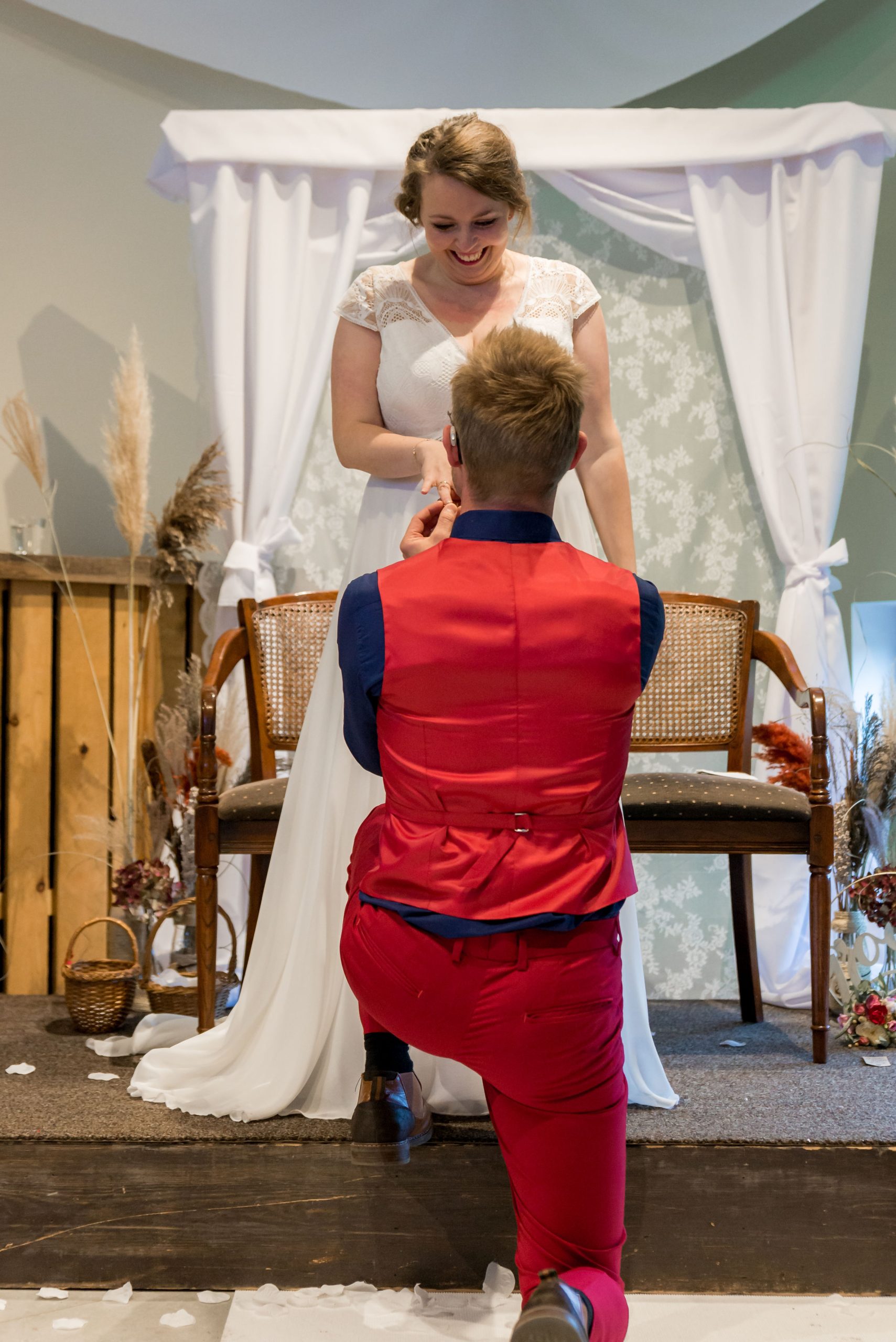 โVoor de tweede ceremonie had ik een andere jurk aangetrokken. Dat wist Jakke niet: hij maakte zich van tevoren al zorgen of ik wel zou kunnen dansen tijdens de openingsdans. Jakke kwam al dansend naar binnen voor de ceremonie, daarna volgde ik met mijn vader en twee nichtjes. Zij waren bloemenmeisjes, maar te jong om dat helemaal te snappen. Daarop besloot mijn vader de bloemen over me heen te gooien: daarmee stal hij echt de show. Dat was achteraf extra bijzonder, want hij kreeg vijf weken na de bruiloft een herseninfarct.