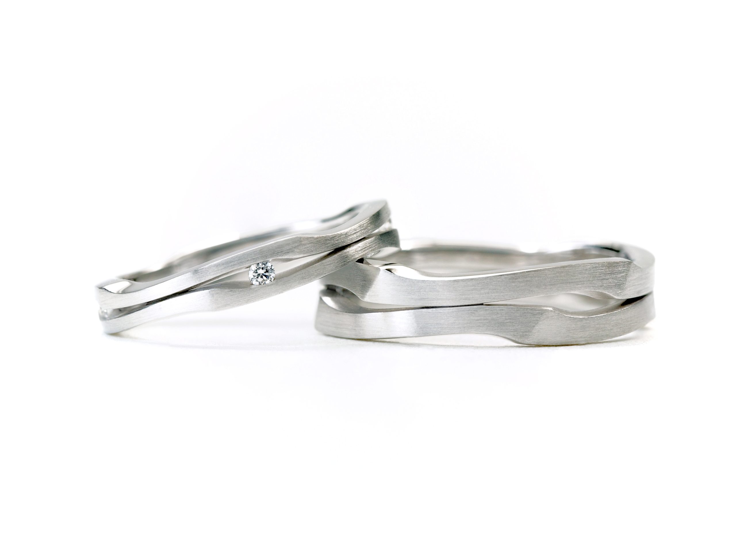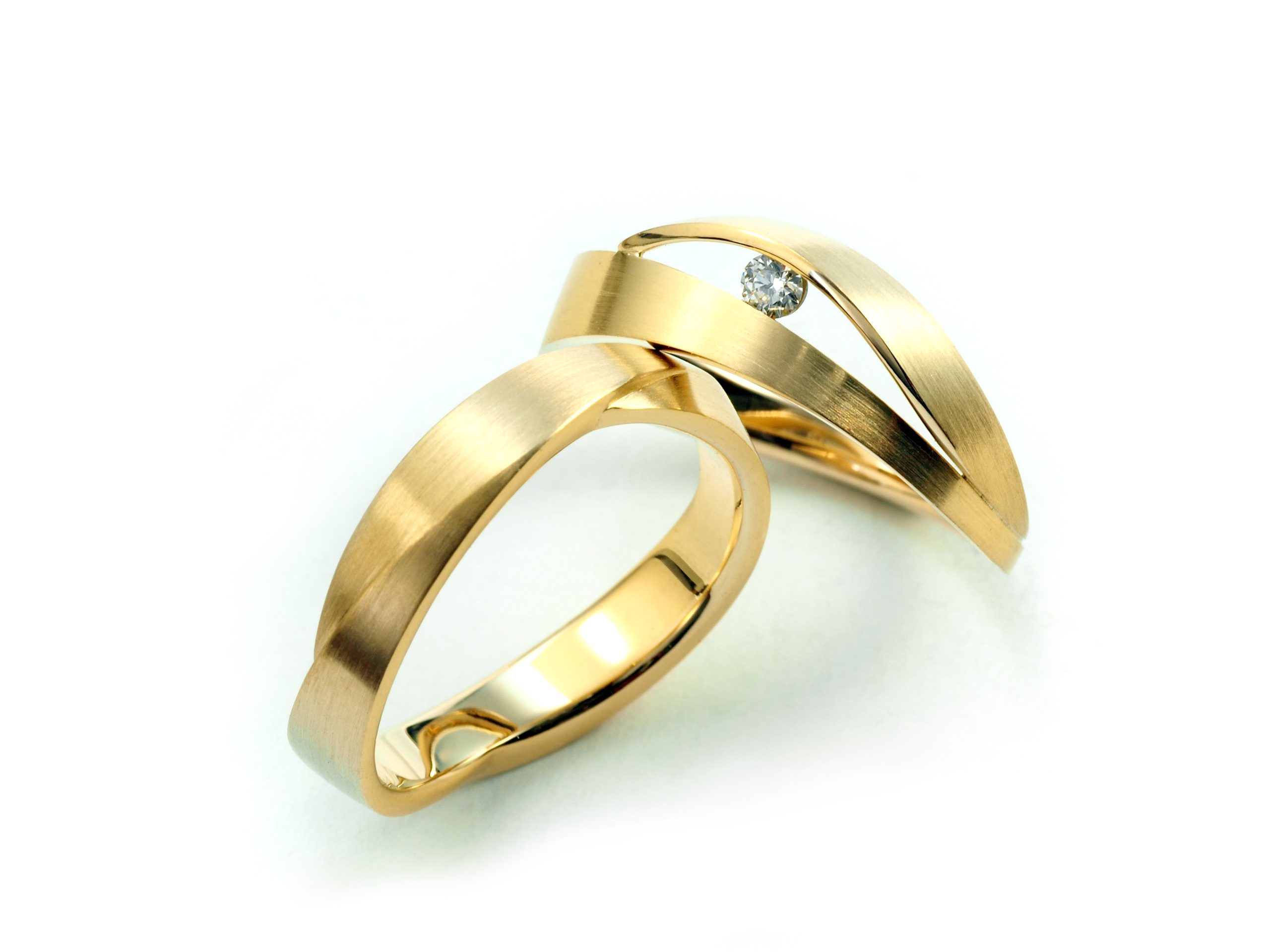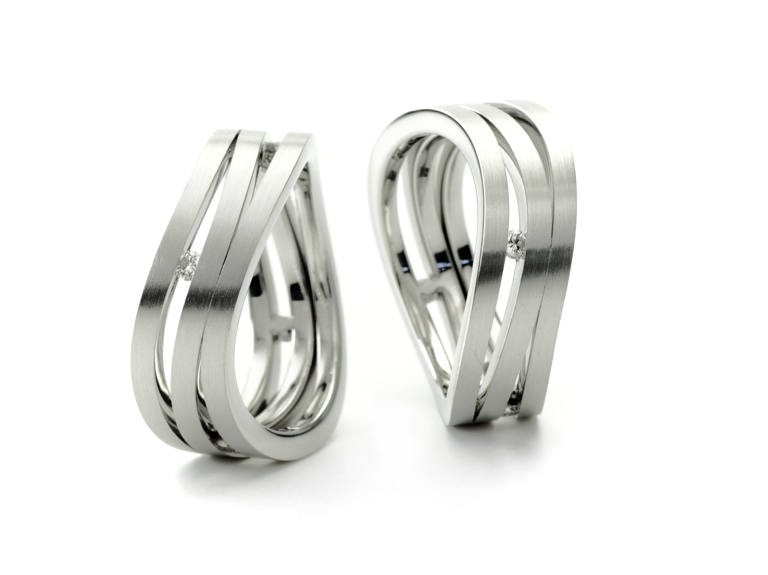 Naast geometrische vormen zijn vloeiende lijnen ook erg belangrijk in moderne ringen. Ze lijken op natuurlijke bewegingen en vormen, zoals de vormen van een rivier of de rondingen van het menselijk lichaam. Vloeiende ontwerpen geven een trouwring een zachte en elegante uitstraling. Ze voelen vaak natuurlijker aan dan strakke lijnen. Dit maakt ze perfect voor bruidsparen die houden van een romantische look. Voorbeelden van ringen met vloeiende lijnen: