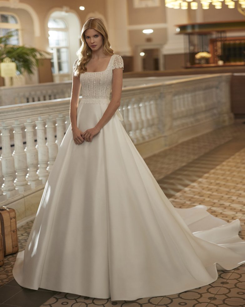 Deze halslijn is perfect voor bruiden die een bescheiden, maar stijlvolle look willen. Dankzij de brede halslijn wordt de aandacht naar het gezicht en de schouders getrokken, wat een prachtig effect creëert. Vooral lange en slanke figuren komen goed tot hun recht in deze stijl, omdat de rechte lijn de bovenkant mooi in balans brengt met het silhouet.