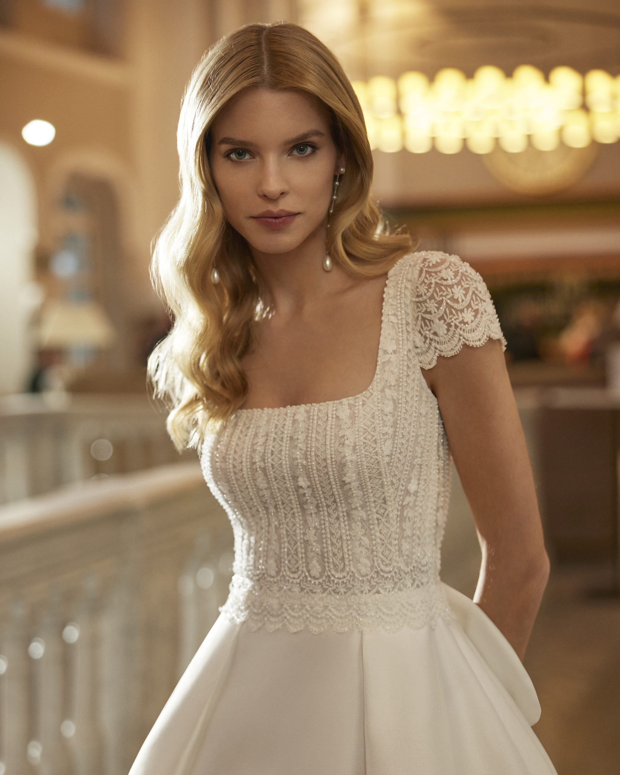 Deze stijl werkt het beste voor bruiden met een rond gezicht of een vollere buste, omdat hij de schouders in balans brengt en het silhouet verfijnt. Wil je de moderne look extra versterken? Combineer een vierkante halslijn met een satijnen jurk voor een chique, tijdloze uitstraling, of ga voor subtiele kantdetails om een romantische touch toe te voegen.