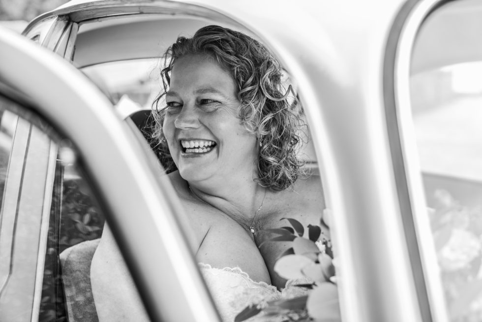 “Op de ochtend van onze bruiloft maakten we ons op een bijzondere manier klaar: Peter in de schuur, ik in de woonkamer, want we wilden een first look doen. De spanning steeg toen het tijd was voor onze first look. Maar Peter zei gelijk: “Wow, wat ziet je er mooi uit.” Ik vond het vooral spannend of hij mijn jurk wel mooi zou vinden. Hij had daar van tevoren nog wat opmerkingen over gemaakt, maar gelukkig viel alles meteen van me af toen ik hem zag stralen.”