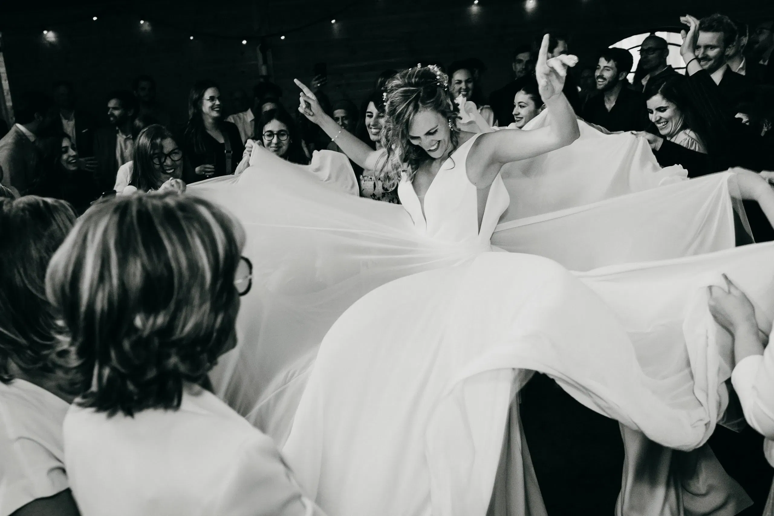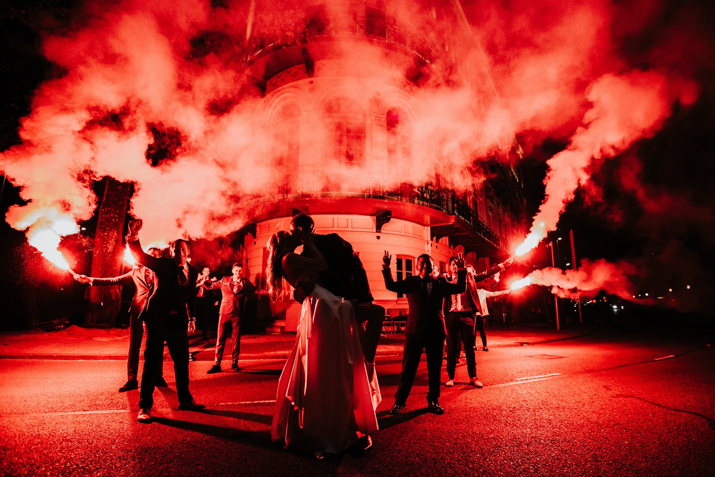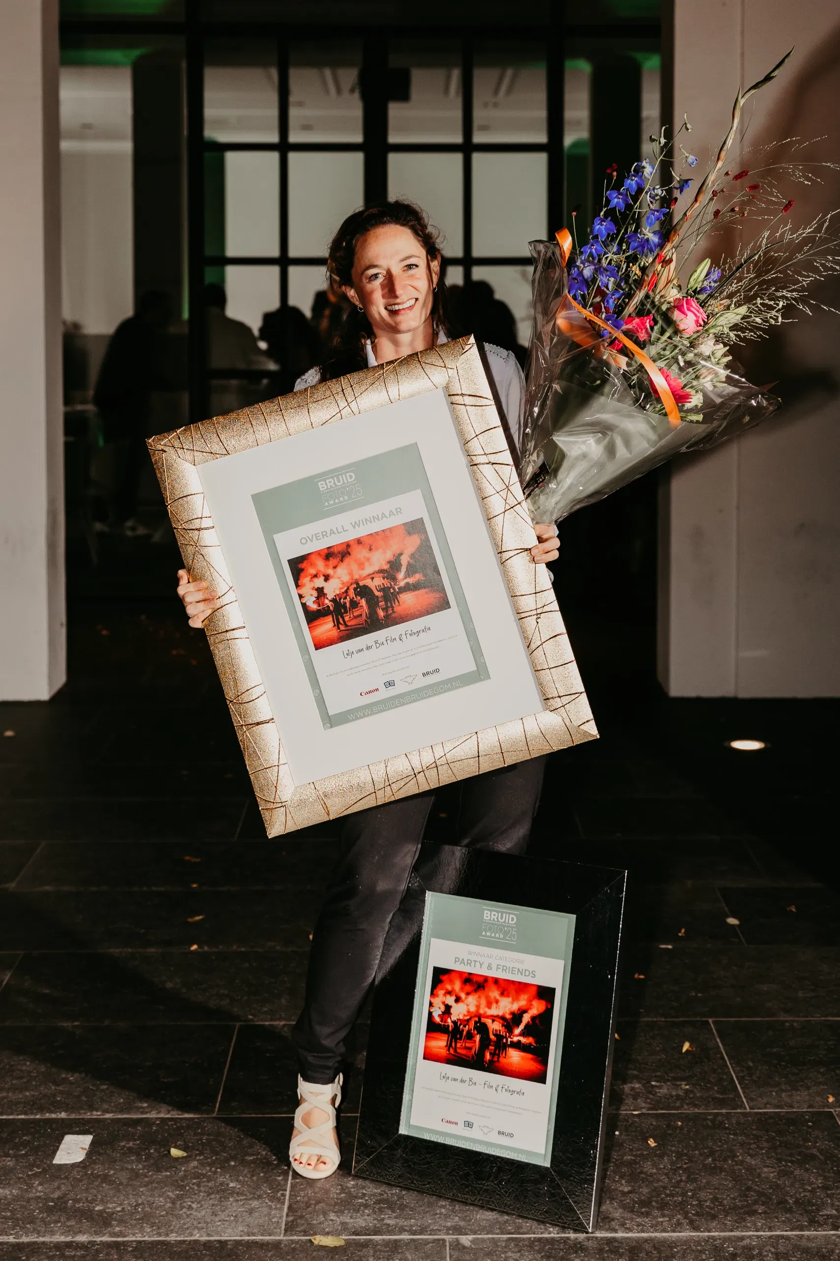 Als de avond valt, en iedereen misschien al wat drankjes op heeft, barst het feest los! Dansende vrienden, live muziek, kleurrijke lichten en speciale momenten die vrienden of familie creëren. Zo hebben de vrienden en familie uit op de foto van Lotje van der Bie uitgepakt met fakkels. Het creërt sfeer en een fantastisch mooi beeld. Lotje heeft met deze foto de Bruidsfoto Award in de categorie Party & Friends gewonnen en is hiermee de de Overall winnaar geworden van de Bruidsfoto Awards 2026! Ze heeft de meeste stemmen van het publiek ontvangen met haar prachtige foto.