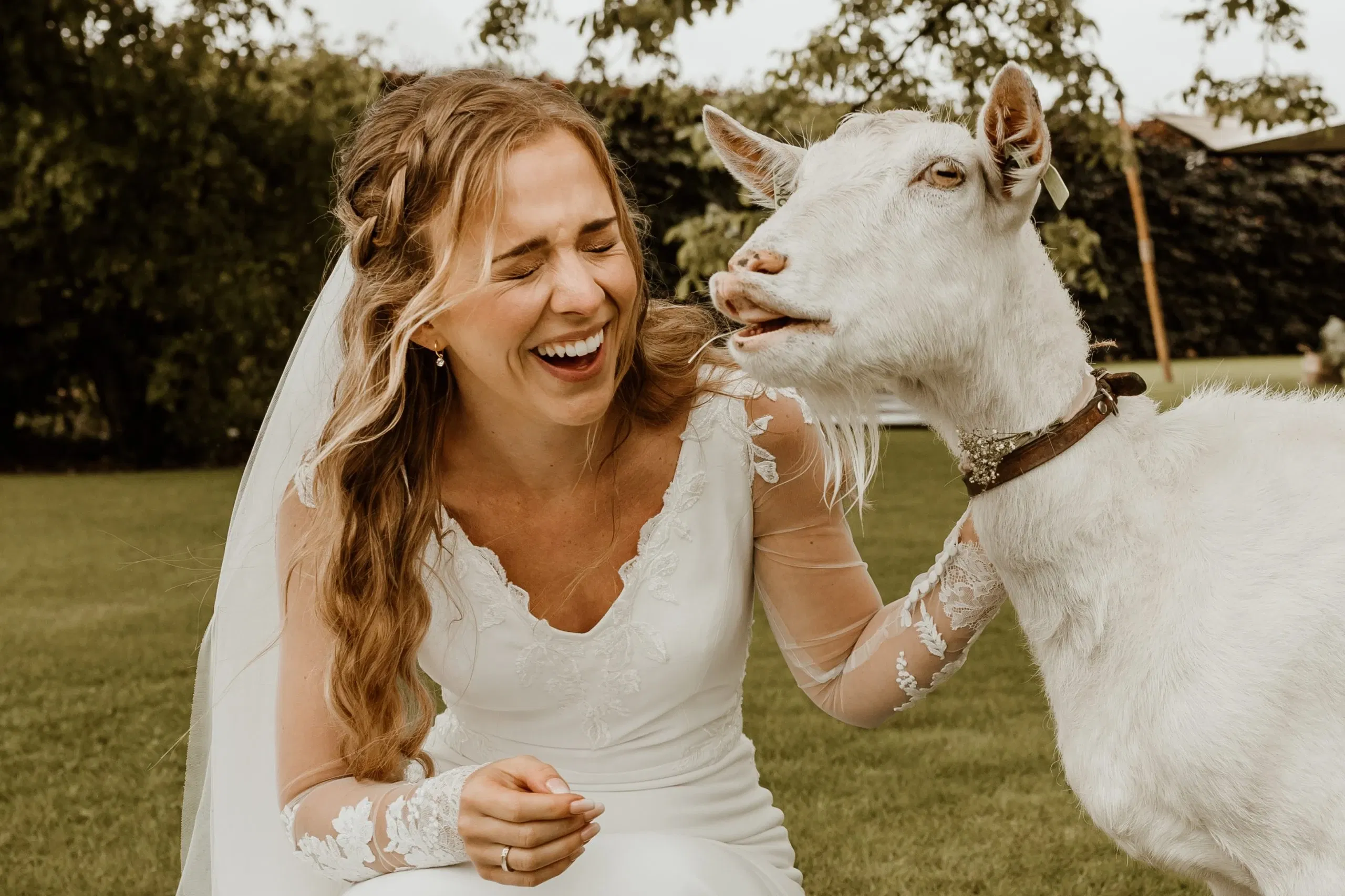 Humor maakt een trouwreportage luchtig en onvergetelijk. En soms maakt een fotograaf per ongeluk een enorm grappig shot. Deze momenten kun je niet plannen, zoals een foto van een bruid. Ze ontstaan. Net zoals deze foto van Marilyn Fotografie van een bruid met haar eigen geit Suus. Een ontzettend mooi en grappig beeld, maar wat wel helemaal bij het bruidspaar hoort. Marilyn heeft de Bruidsfoto Award in de categorie Grappige Scènes mee naar huis genomen.