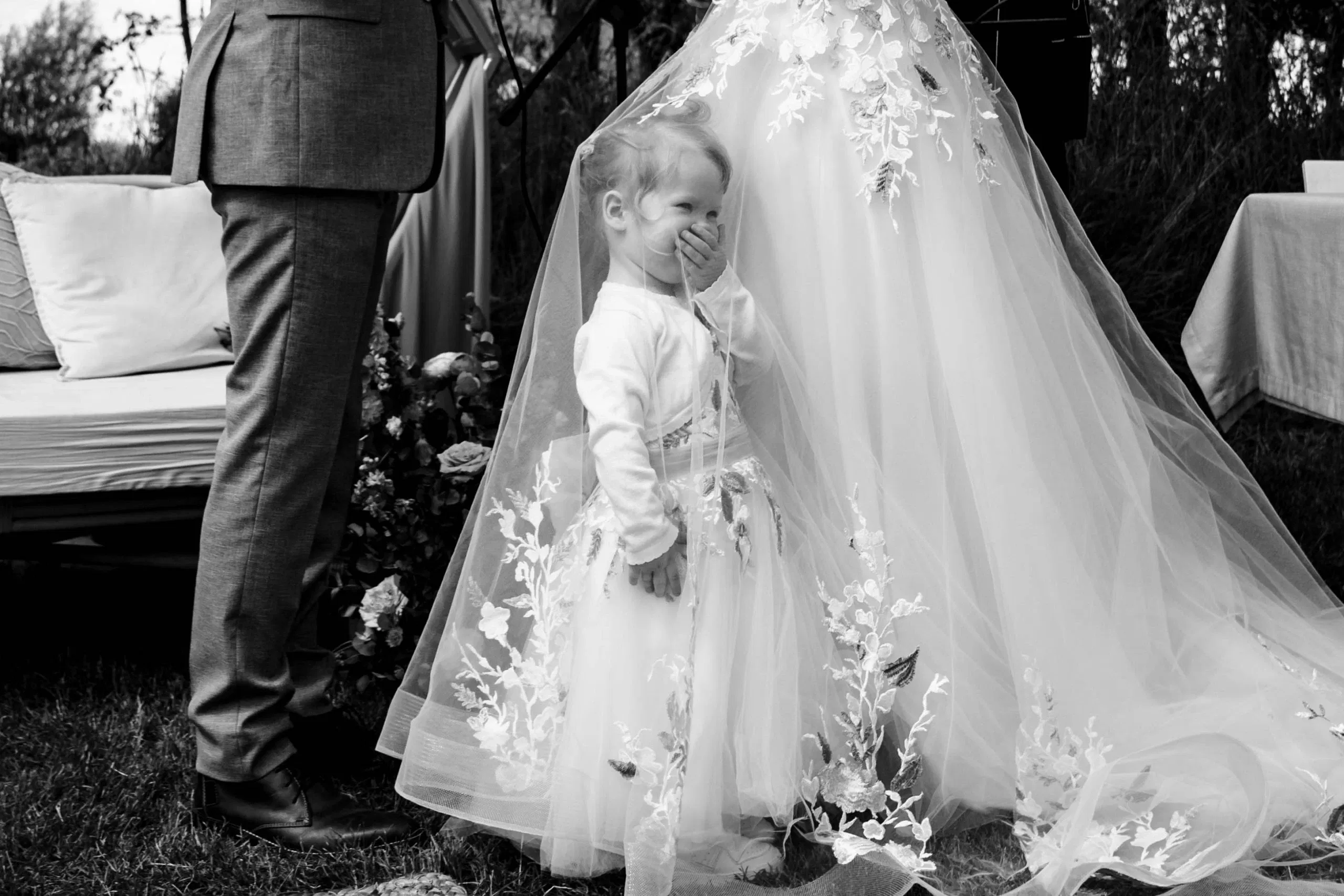 Heb jij kinderen op je bruiloft? Kinderen zorgen namelijk vaak voor de meest onverwachte en grappige moment. Hun enthousiasme en speelsheid leveren trouwfoto’s op die iedereen laten glimlachen. Dus laat ze lekker zichzelf zijn! Zo heeft Shanine Roosingh Photography deze hilarische foto gemaakt van een kind dat onder de jurk kroop tijdens de ceremonie en hardop lacht. Met deze foto heeft ze de Bruidsfoto Award in de categorie Bruidskinderen gewonnen.