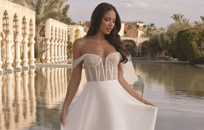 Justin Alexander is klassiek, verfijnd en tijdlook. Het is luxe op zโn best! In deze collectie draait het om rijke stoffen met handgemaakte details โ elegantie met een vleugje Old Hollywoold Glamour.