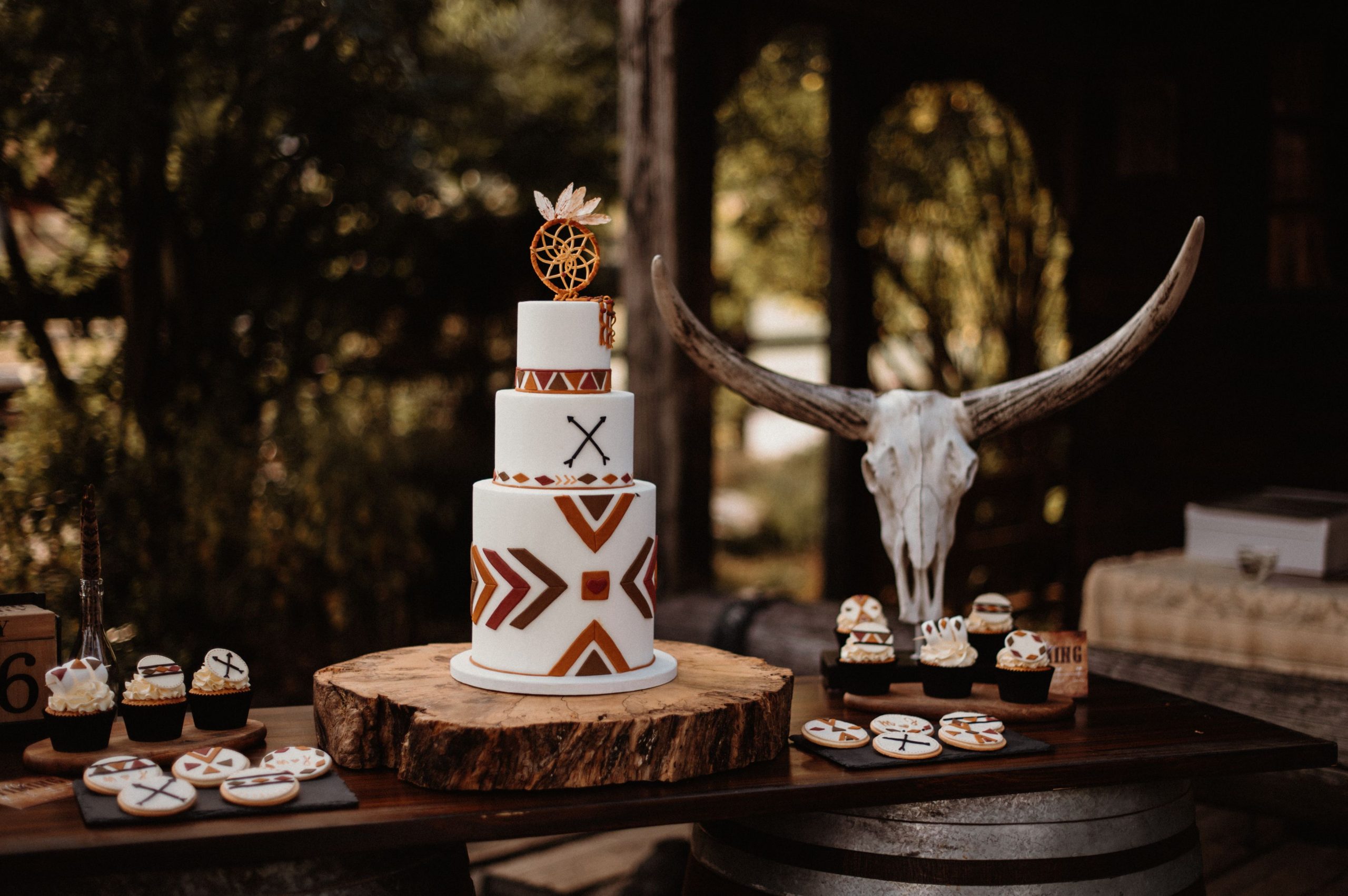 Leg een lange, houten plank over twee oude wijnvaten en voilà: je hebt een rustieke sweet table in western-stijl. De bruidstaart is versierd met passende ornamenten en heeft een kleine dromenvanger bovenop, een absolute blikvanger! Serveer de taart op houten plankjes om helemaal in huwelijksthema te blijven.